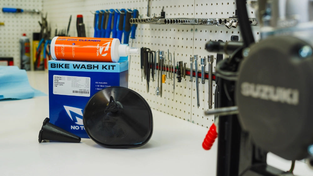 Bike Wash Kit includes an injection molded plastic wash cover with a thick rubber seal, a sample bottle of No-Toil Air Box Cleaner and an exhaust plug.